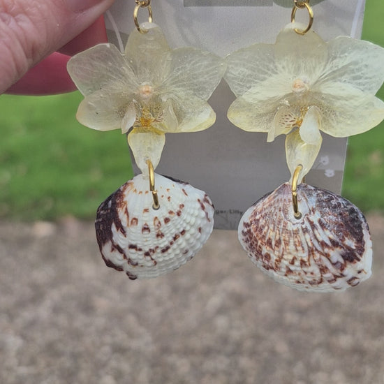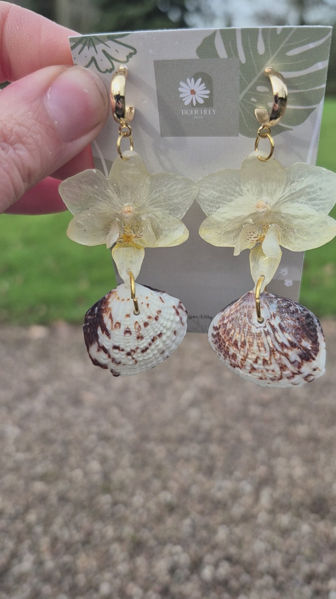 Wear a piece of nature’s beauty with these exquisite orchid and shell earrings—perfect for any occasion.