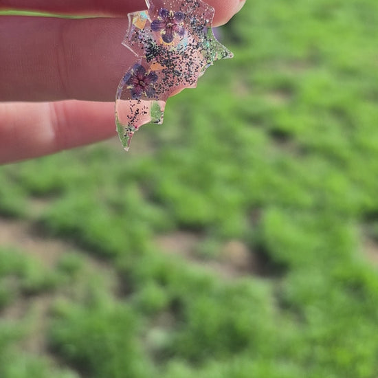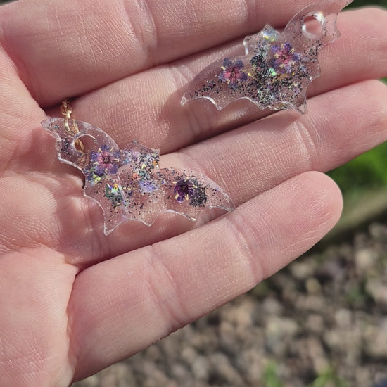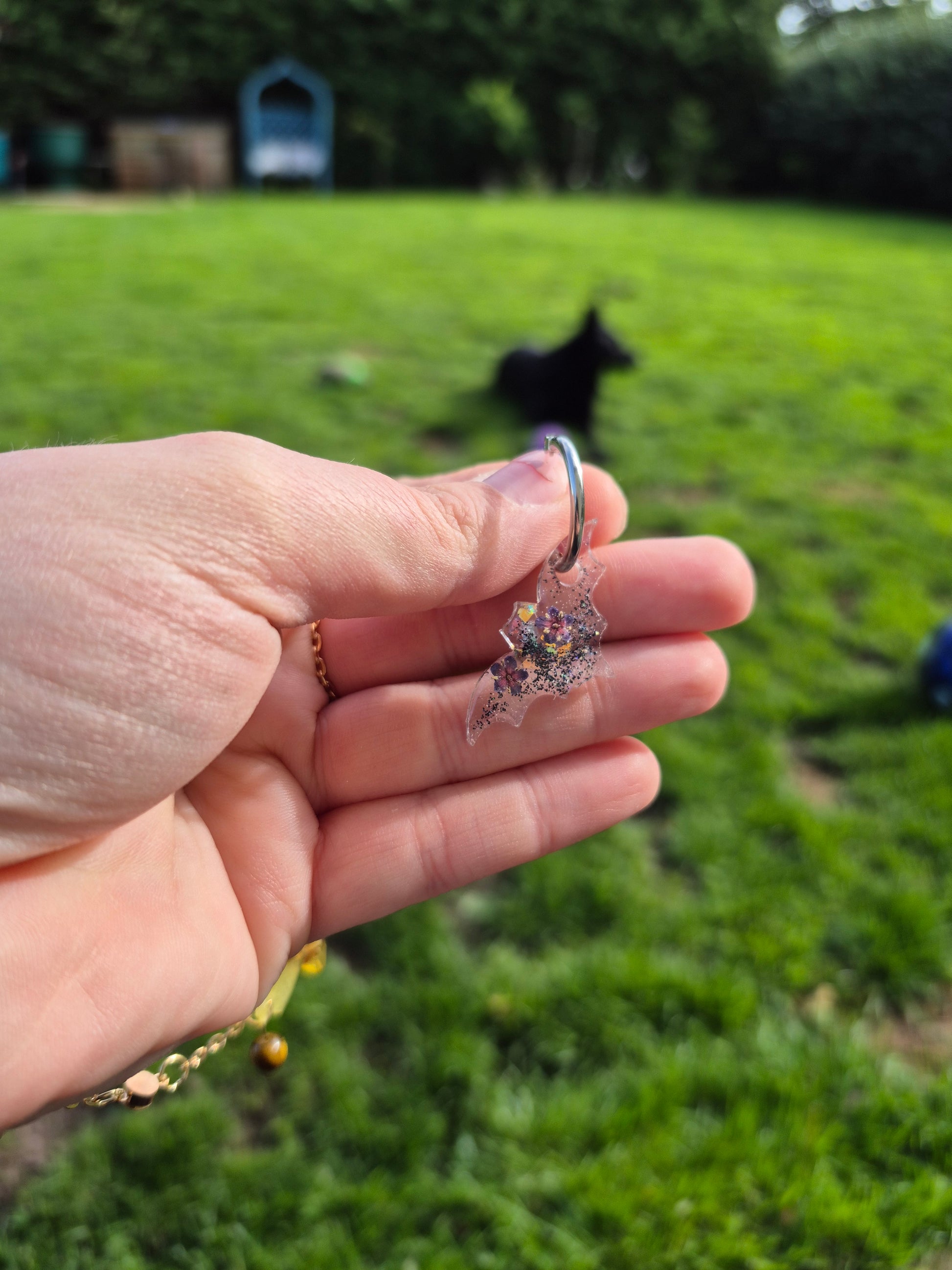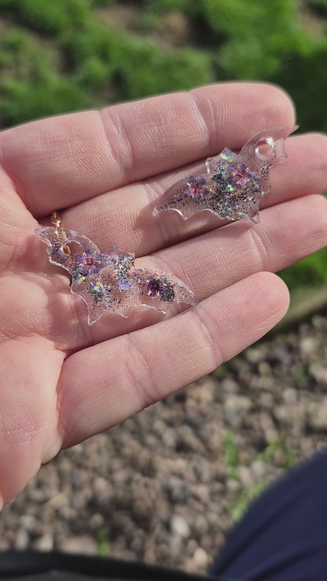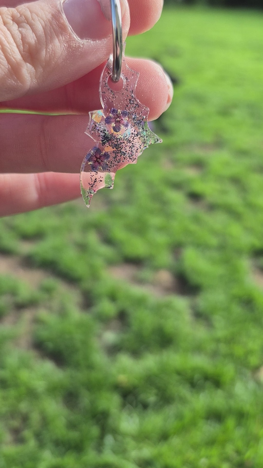 Bat shaped floral hoop charm with a mix of forget me nots, elderflower and glitter.