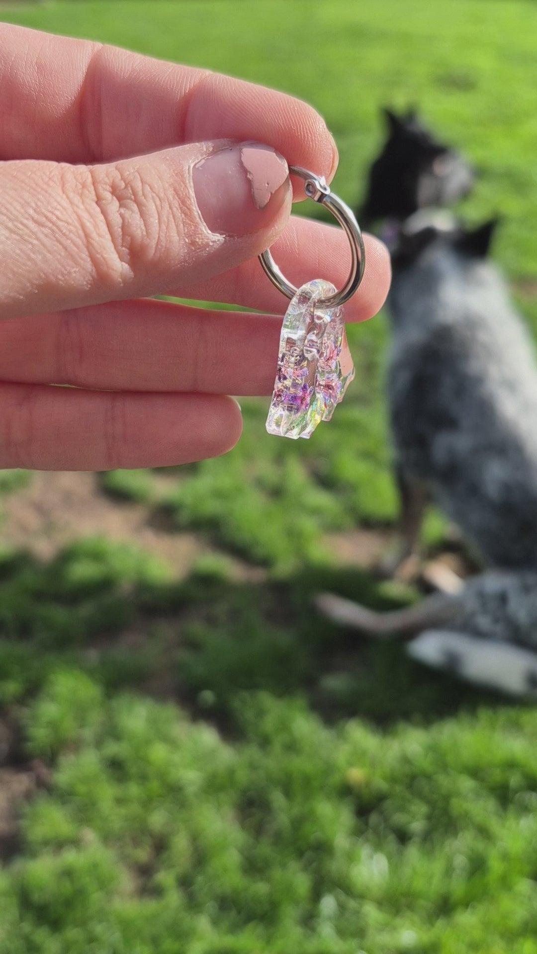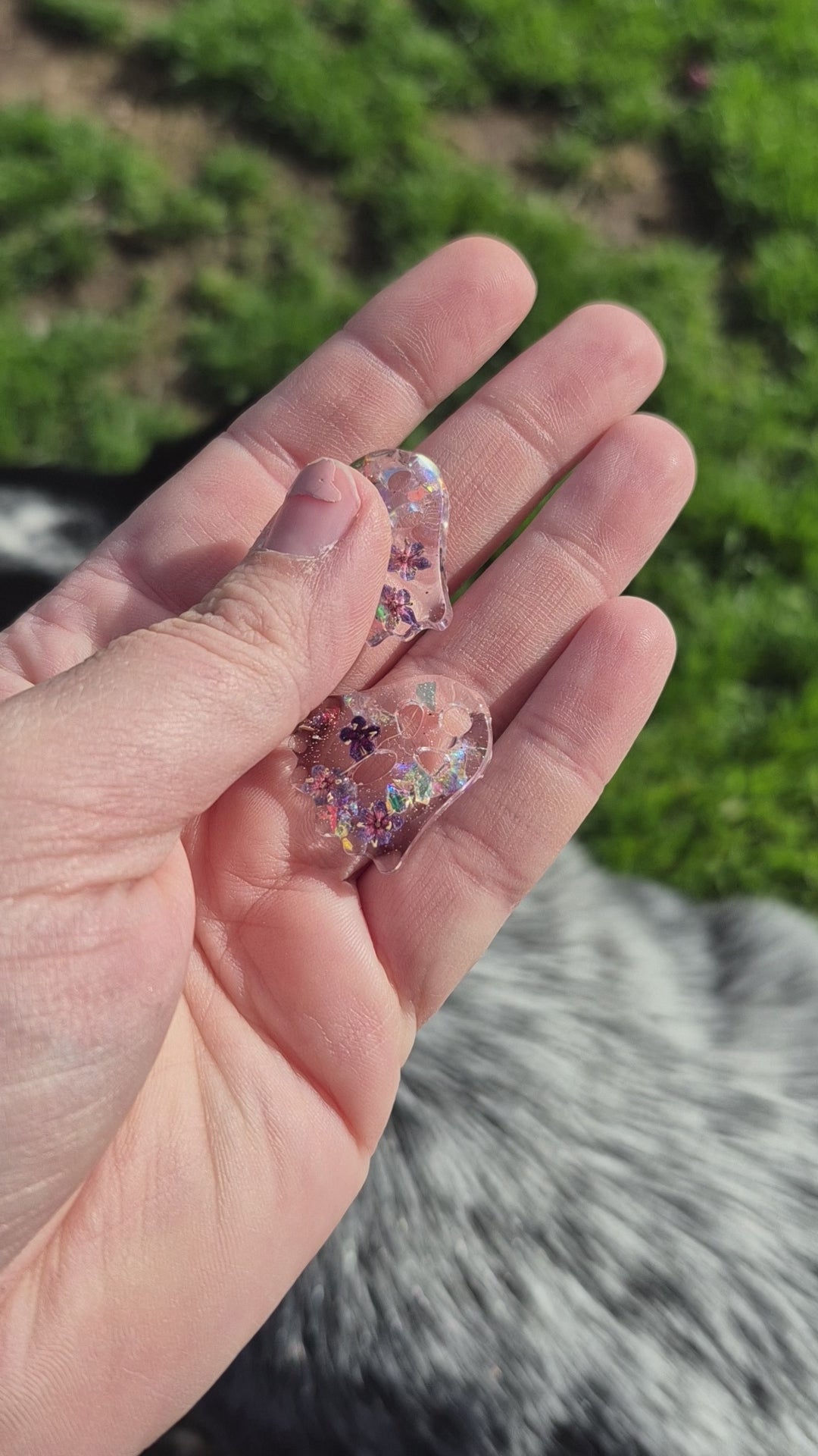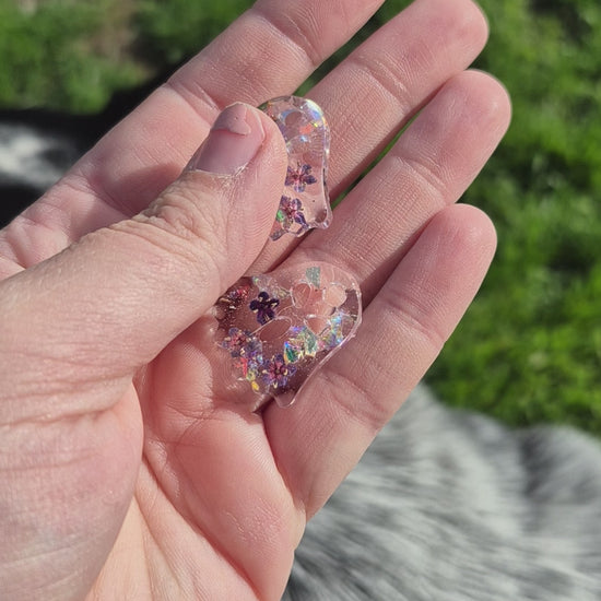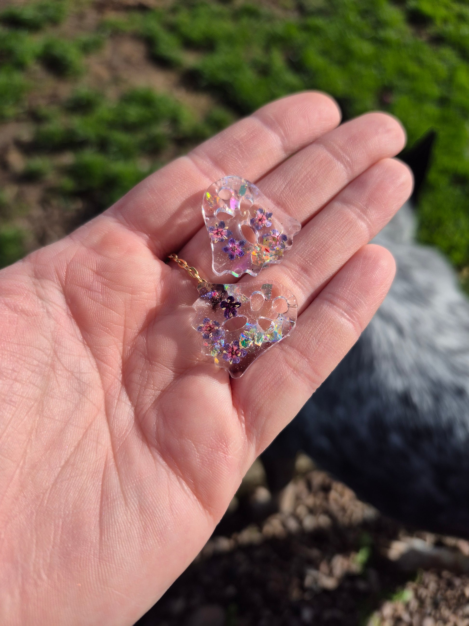 Floral ghost hoop charms with a mix of forget me nots, elderflower and glitter.
