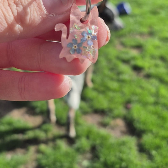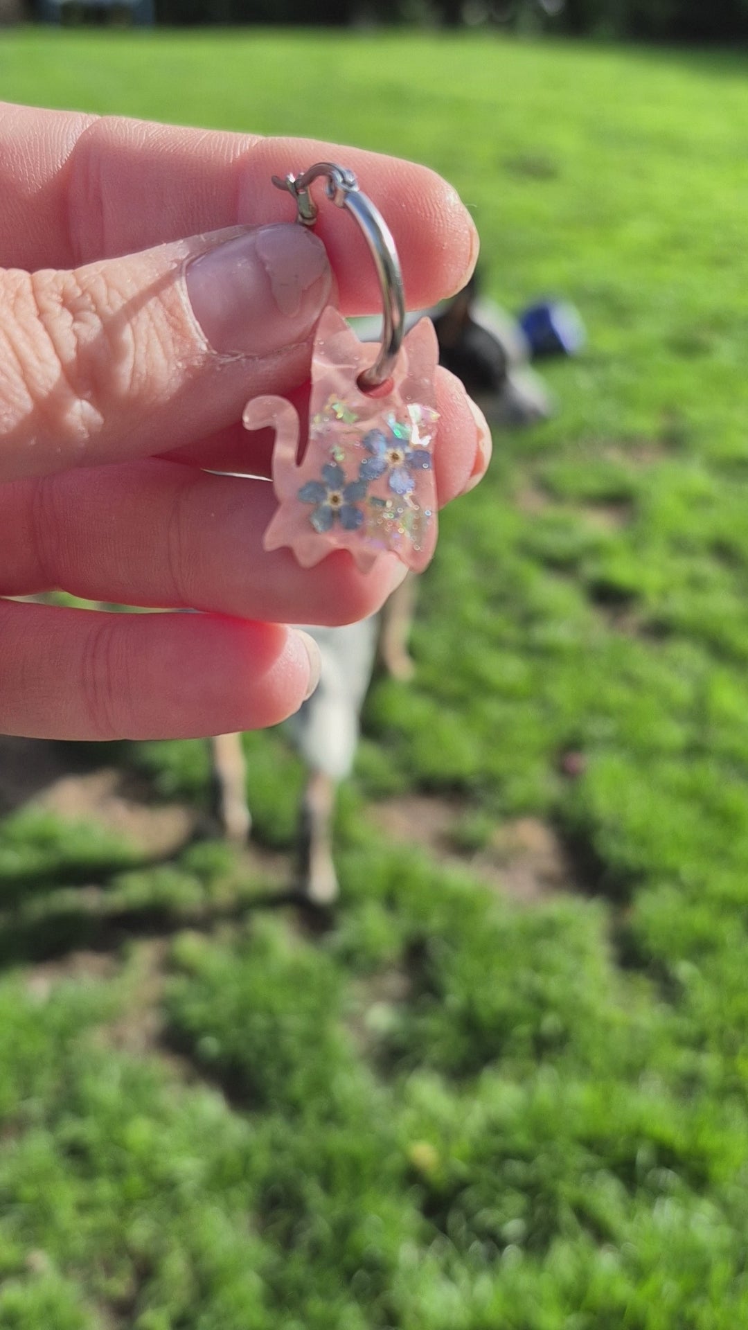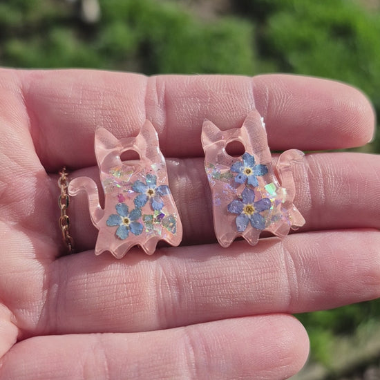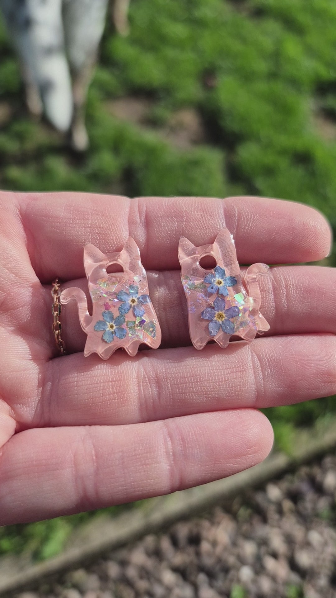 Kitty ghosts hoop charms with forget me nots and glitter.