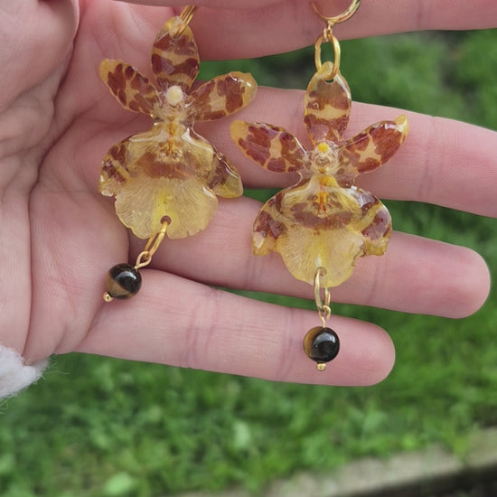 Real Oncidium Orchid Resin Earrings with Tiger’s Eye – Gold or Silver-Plated Half Hoops 🌸✨🐅