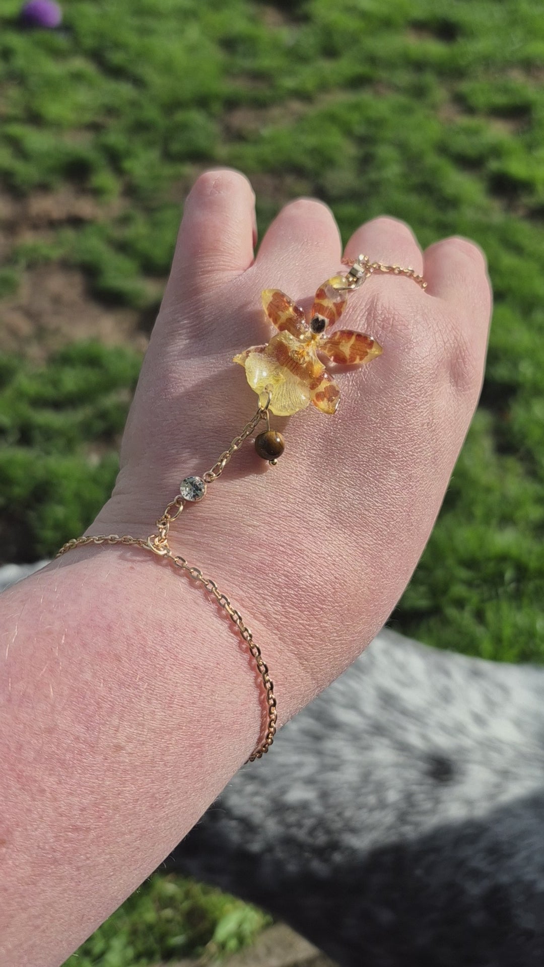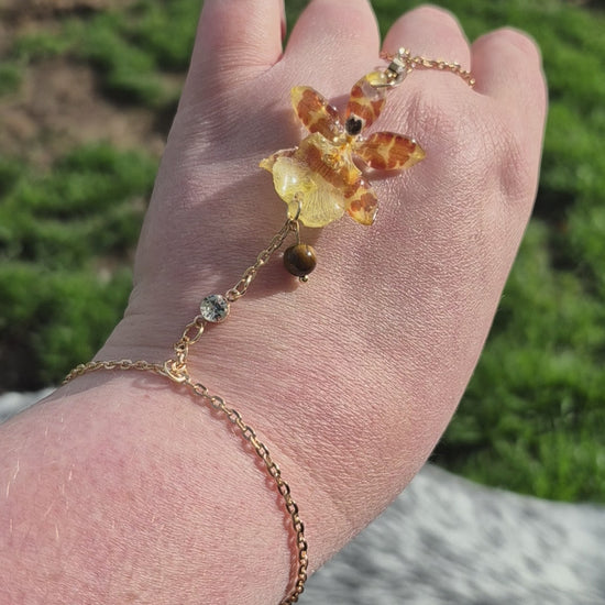 Real Oncidium orchid preserved in resin – each hand chain is one-of-a-kind