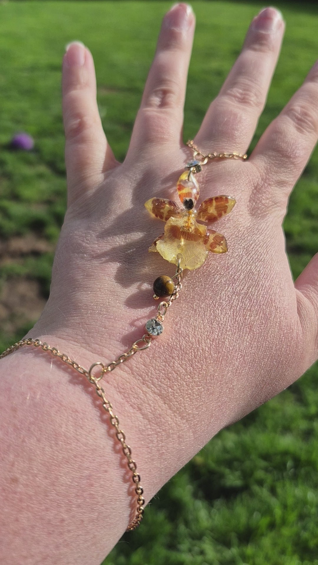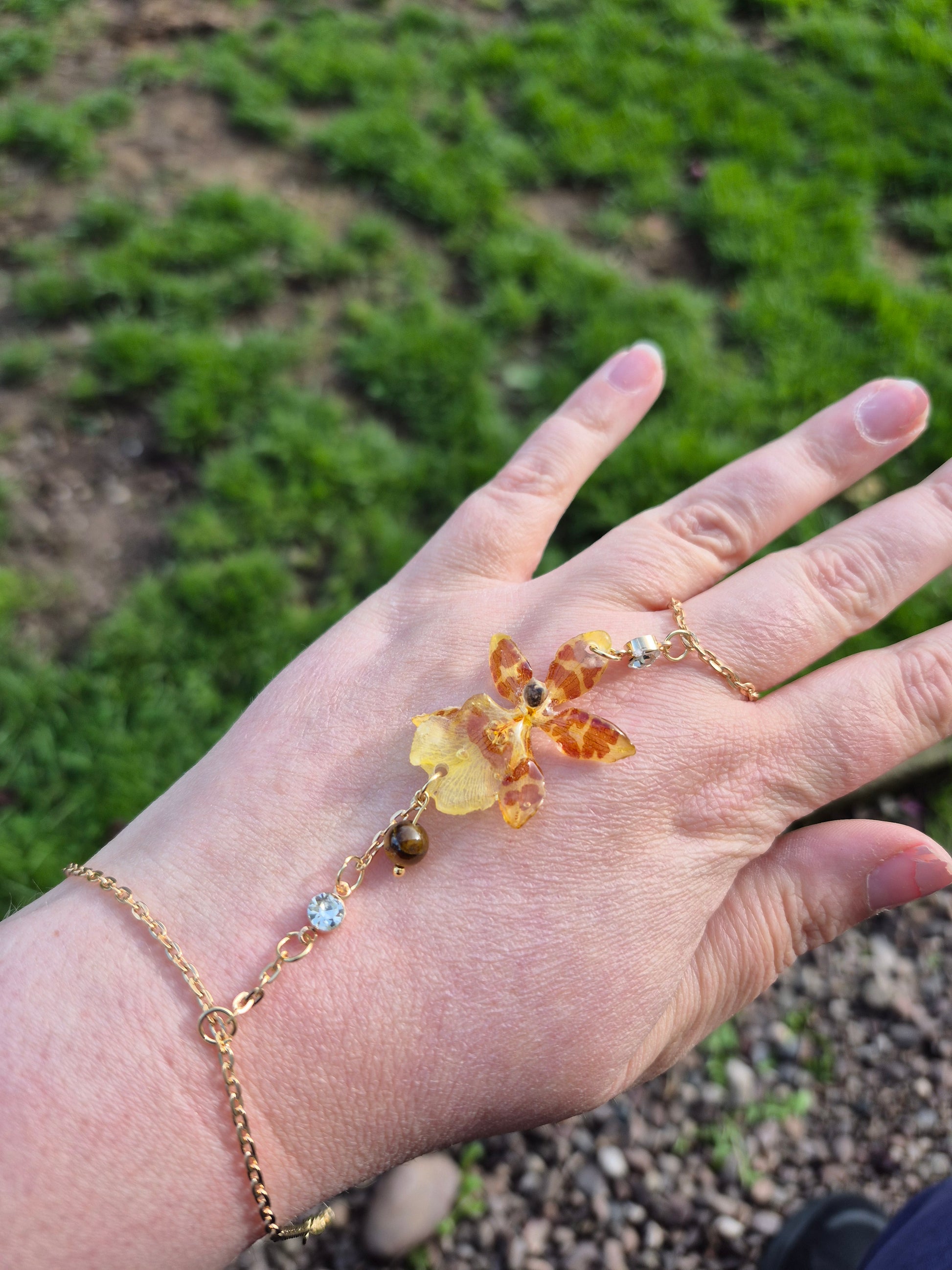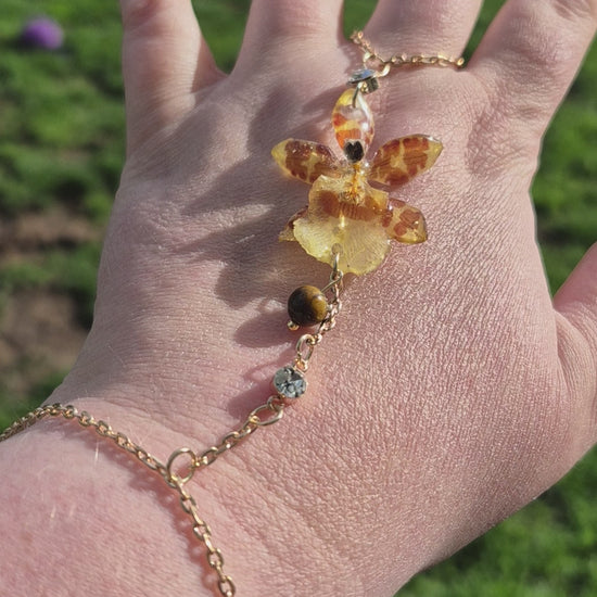Celebrate the beauty of nature and the grounding energy of gemstones with this handmade hand chain, featuring a real Oncidium orchid preserved in crystal-clear resin and accented with a genuine tiger’s eye gemstone. Each piece is completely unique, showcasing the intricate patterns and vibrant colors of the orchid alongside the warm, earthy tones of the tiger’s eye.