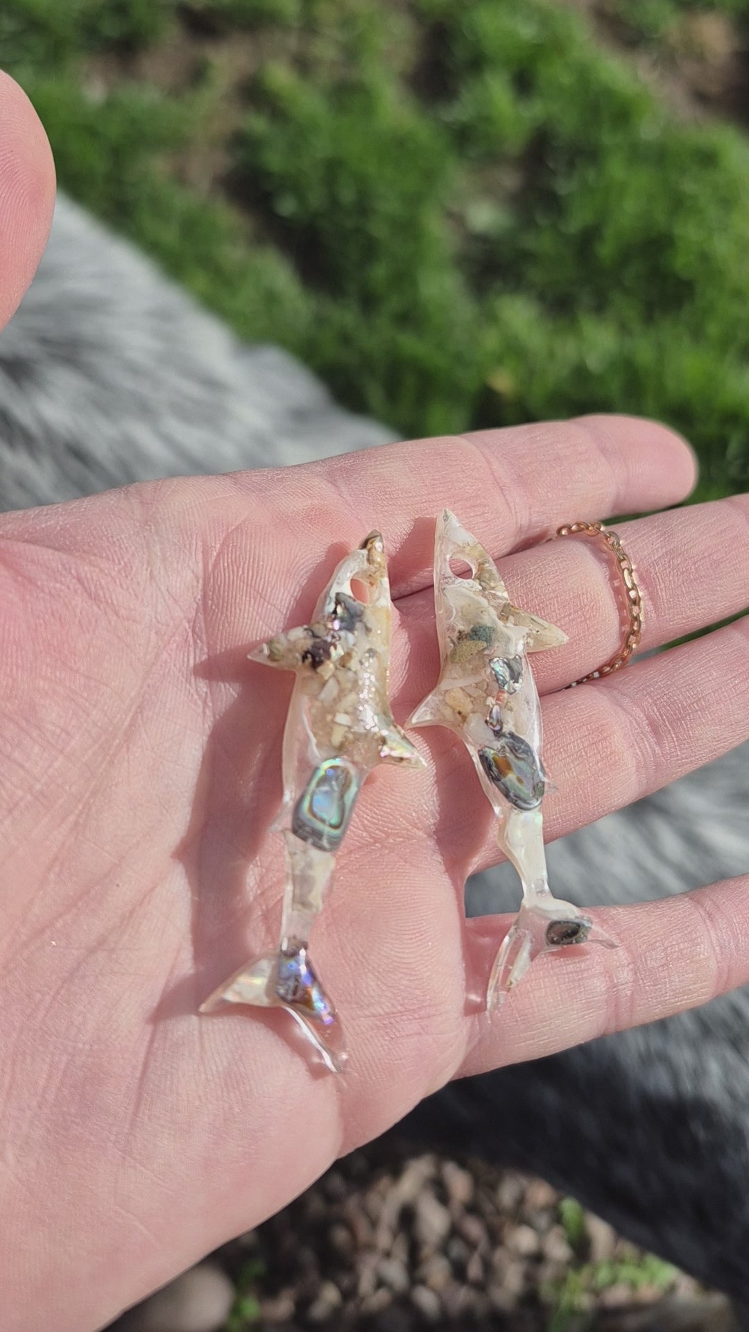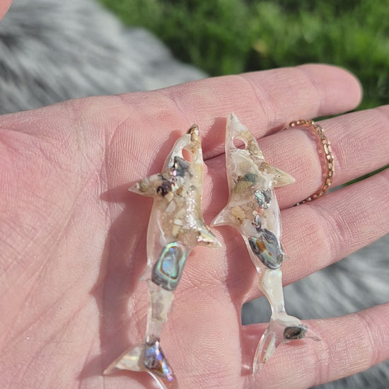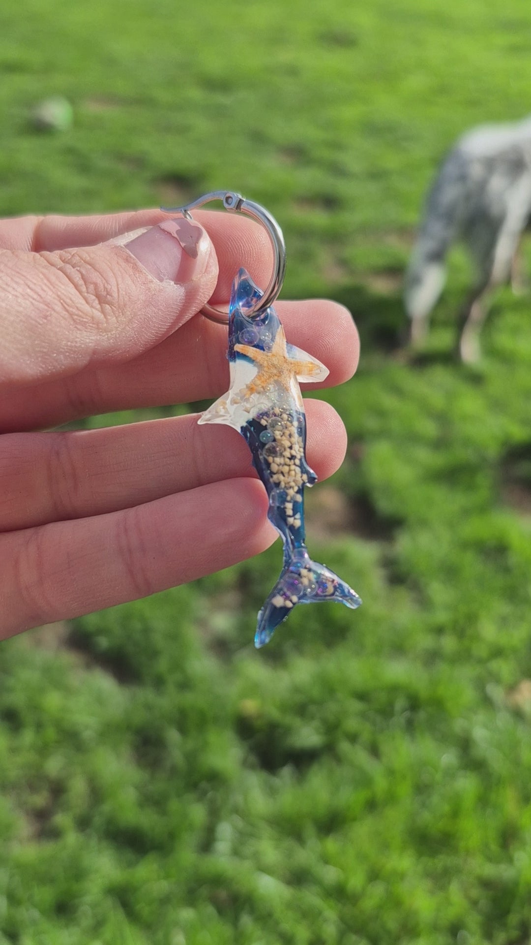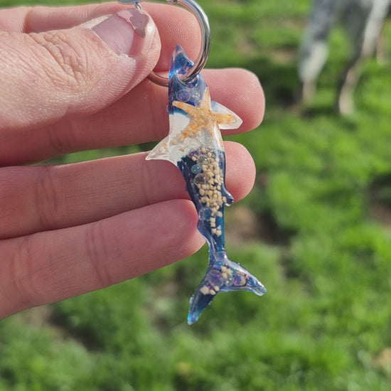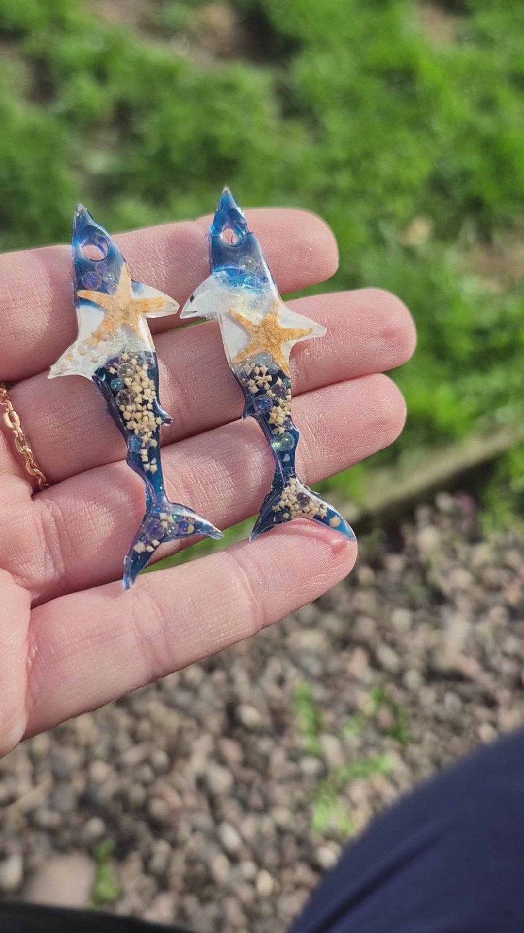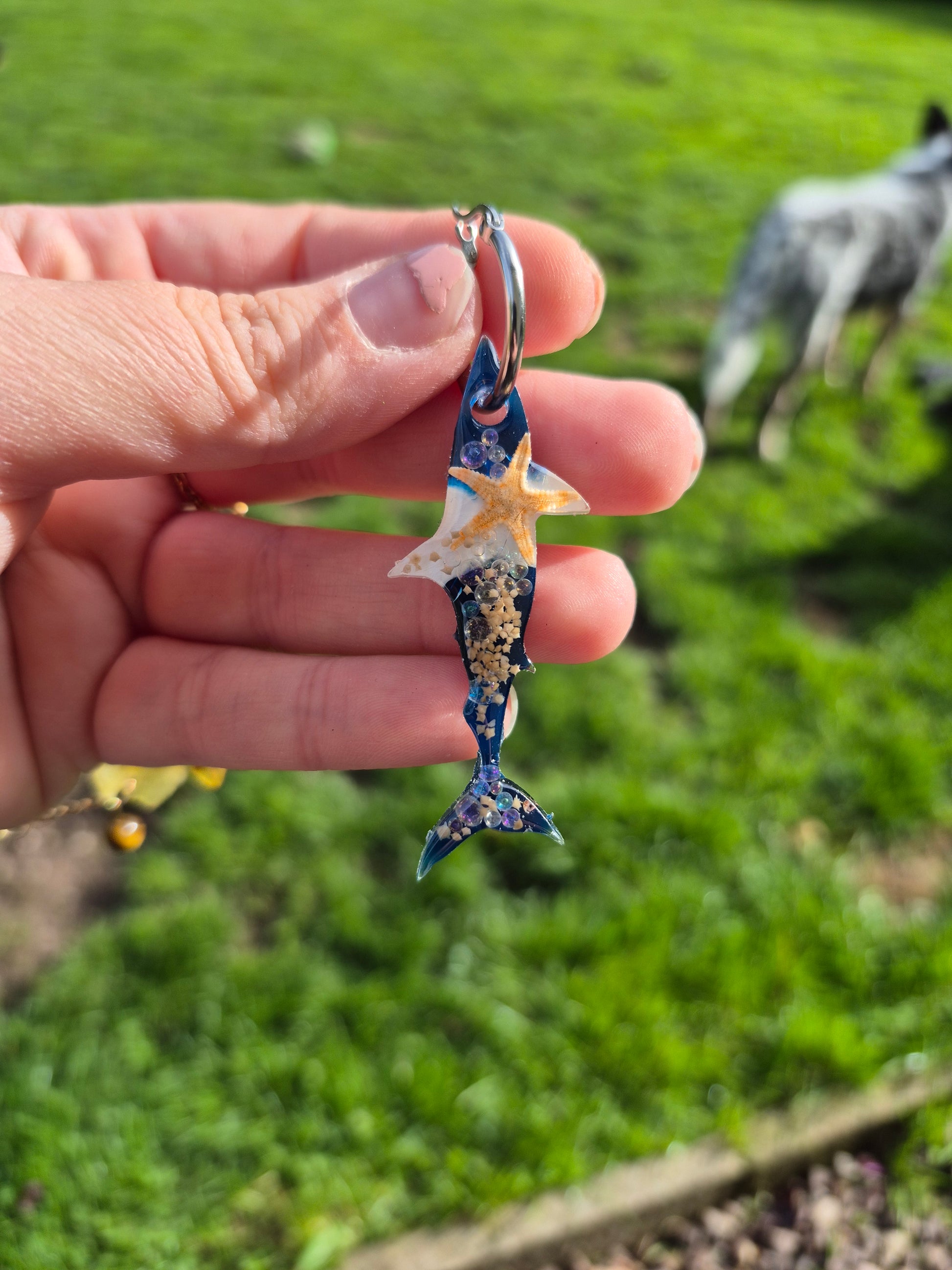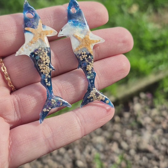 Shark shape resin hoop charms with real mini starfish and shells available in 2 designs