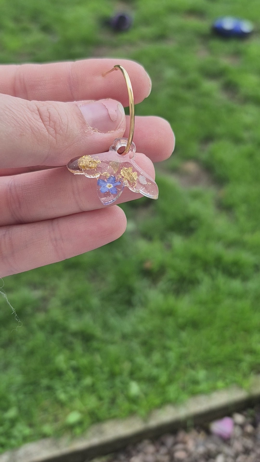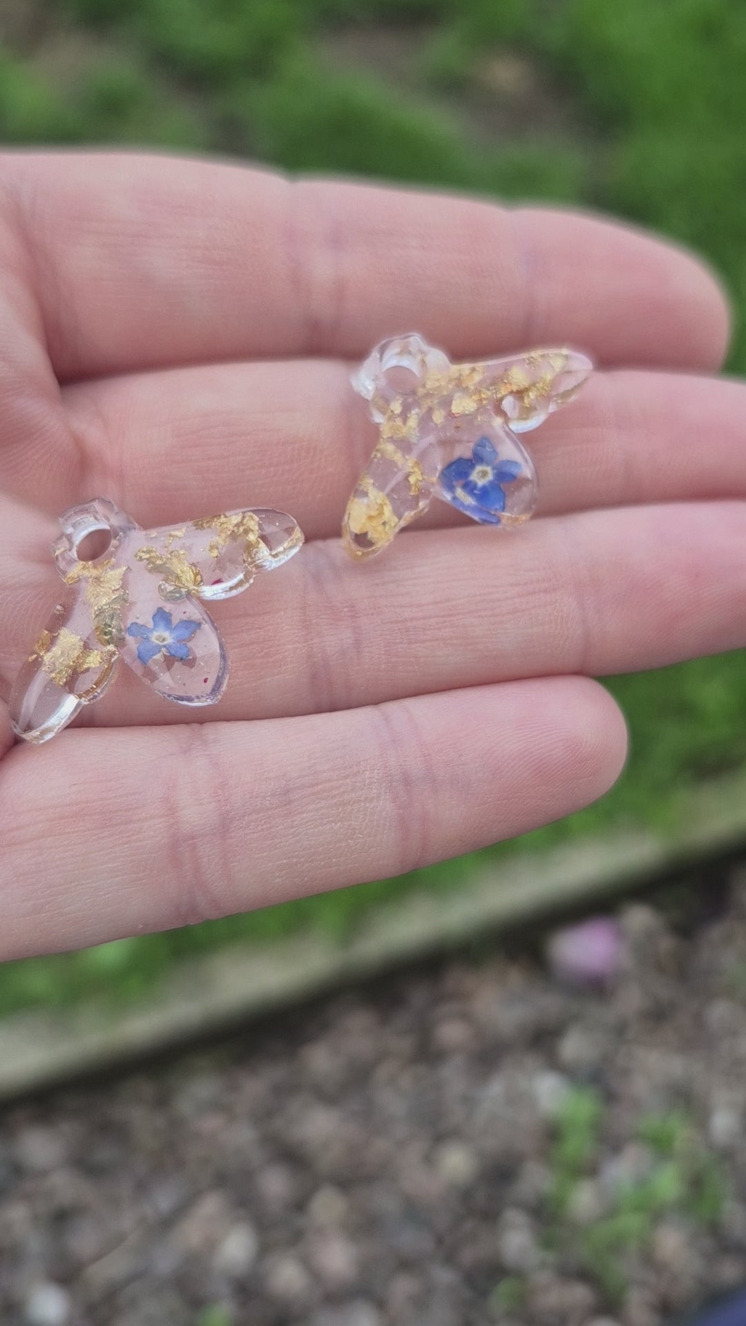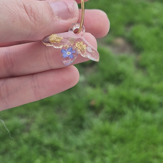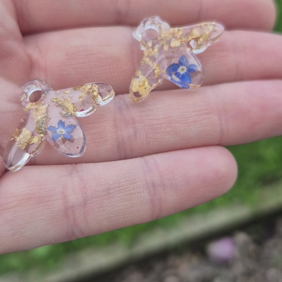 Bee resin shape with real forget me not flowers and gold leaf.